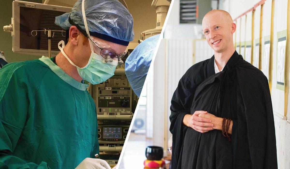 “Often my seven-piece robe is a set of scrubs or white coat,” he says, “But really, for all of us, it’s the invitation to be the bodhisattva. To be that compassionate person reaching out to the world to help amidst suffering.”