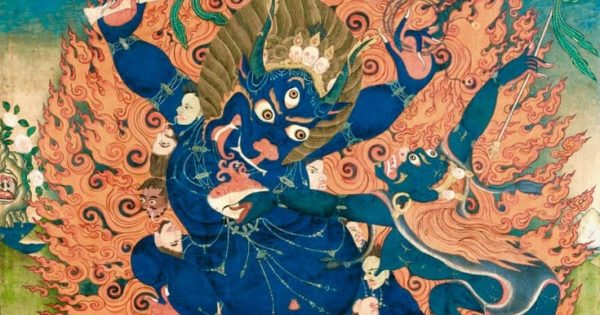 Protector Yama Dharmaraja, with the head of a buffalo. Above center is the dakini Simhamukha. Yama is a wisdom deity protector of anuttara yoga tantra. Tibet, 19th century, Sakya and Gelug Lineages, Ground Mineral Pigment, Fine Gold Line on Cotton, Rubin Museum of Art, item no. 404 | www.himalayanart.org