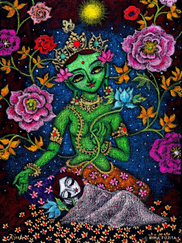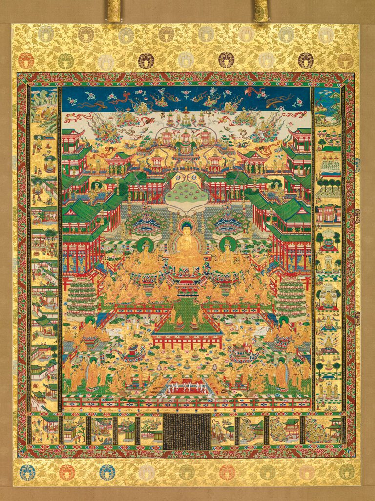 According to his vow, anyone who sincerely recites his name can be reborn in the Pure Land created through the power of his commitment. In this purified abode—a “buddhaverse,” if you will—the dharma is continuously taught, even in the songs of birds, the whisper of the wind through jeweled trees, and the murmur of streams. In short, it offers ideal conditions for awakening.
