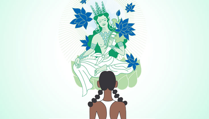 Lama Palden Drolma teaches how to visualize the deity Green Tara, who embodies one’s buddhanature. Illustrations by Tomi Um.